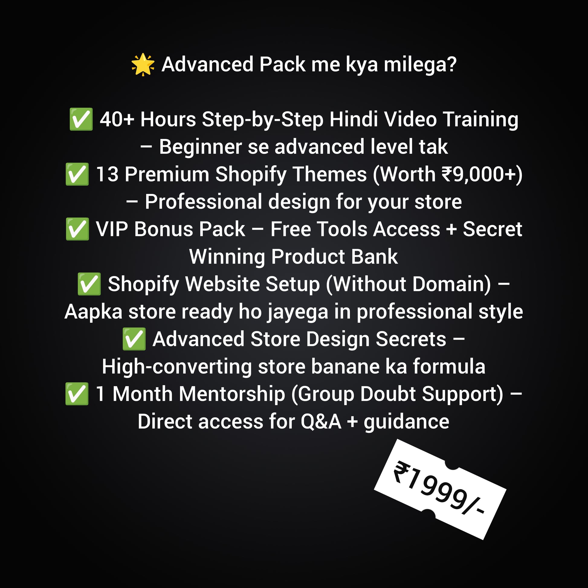 Sirf ₹1,999 me aapko milega poora training + resources ke sath Shopify Website Setup (without domain) aur personal mentorship jisse aap apna business confidently start kar paoge.